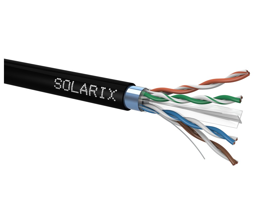 Instalační kabel Solarix s označením SXKD-6-FTP-PE je spolehlivý venkovní stíněný kabel kategorie 6 který je určený pro provoz ethernetových protokolů, včetně 2.5GBASE-T a 5GBASE-T. Konstrukce kabelu je F/UTP s plastovým křížem, který zajišťuje maximální oddělení párů od sebe po celé délce kabelu. Typ pláště je UV stabilní PE s třídou reakce na oheň Fca a stupněm krytí IP67. Vodiče kabelu jsou vyrobeny z kvalitního měděného drátu s čistotou mědi 99,97%. Kabel bez problémů splňuje požadavky z mezinárodních standardů ISO/IEC 11801, EN 50173 a ANSI/TIA 568.2-D. Stejně jako ostatní kabely Solarix, je i kabel SXKD-6-FTP-PE značen metráží po 1 m v rozsahu od 0 do 500 m. Kabel je dodáván na vysoce pevné dřevěné špulce, na které jsou uvedeny všechny nezbytné produktové informace, včetně čárových kódů, výrobní šarže, popisu a nejdůležitějších technických parametrů. Při instalaci do země doporučujeme vždy použít HDPE chráničku.
