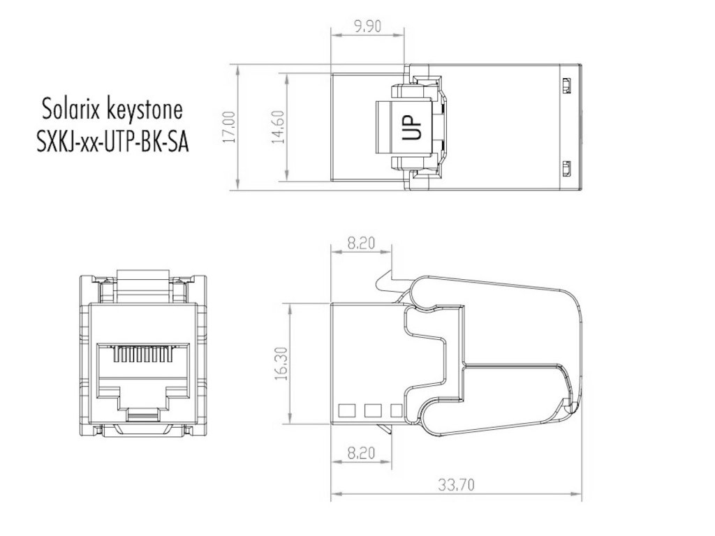 Samořezné keystony Solarix se vyznačují velmi jednoduchou instalací, ke které není nutné použít zařezávací nástroj. Tyto keystony bez problémů splňují parametry specifikované v mezinárodních standardech strukturované kabeláže ANSI/TIA 568, ISO/IEC 11801 a EN 50173 pro kategorii 5E a třídu vedení Class D, včetně všech nejnovějších dodatků. Keystony jsou osazeny 180° samořeznou svorkovnicí, která je označena barevným schématem podle typu zapojení, a to buď podle standardu T568A, nebo T568B. Do této svorkovnice je možné zařezat kabely typu drát s vodiči o velikosti AWG 26 – 22. Standardní barva nestíněných samořezných keystonů Solarix je černá, u stíněné verze je tělo modulu opatřeno stříbrnou kovovou částí. Díky svým kompaktním rozměrům jsou tyto samořezné keystony kompatibilní s modulárními zásuvkami většiny výrobců (např. ABB, Schneider, Legrand, Moeller, Hager, Obzor atd.). Tuto kompatibilitu si můžete ověřit v tabulce kompatibility, která se nachází v souborech ke stažení.